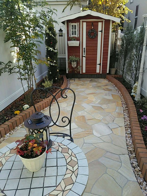 更地だった庭にまず物置(こもれび)を建てた後、コーディネートを考えてフェンスや石張りをし、花壇を作りました。